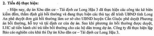 - Khu dân cư - tái định cư Long Hậu mở rộng: tổng diện tích 10ha, hiện đang hoàn thiện các thủ tục pháp lý và bồi thường giải phóng mặt bằng, dự kiến sẽ được triển khai trong năm 2022