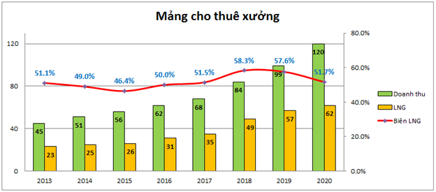 Như vậy có thẻ thấy ngoài các xưởng hiện tại công ty vẫn đang cho thuê tốt thì hàng năm vẫn tiếp tục bổ sung thêm diện tích cho thuê giúp cho mảng cho thuê xưởng vẫn và sẽ liên tục tăng trưởng trong các năm tới. Chúng tôi dự kiến trong năm 2021 mảng này sẽ mang về cho LHG 150 tỷ doanh thu và 80 tỷ LNG.