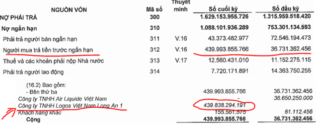 Điểm sáng trong báo cáo tài chính quý 1 để lại đó chính là khoản mục người mua trả trước ngắn hạn tăng đột biến từ 36.7 tỷ lên 440 tỷ. Cụ thể khoản trả trước này đến từ công ty TNHH Logos Việt Nam Long An 1 với con số là 439 tỷ. Cụ thể như ảnh 6 dưới