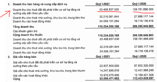 Bóc tách kết quả kinh doanh của công ty như phần thuyết minh chi tiết chúng ta có thể thấy doanh thu của công ty được đóng góp bởi 3 mảng chính là cho thuê đất KCN, cho thuê nhà xưởng và từ hoạt động khác. Cụ thể như ảnh 5 dưới: