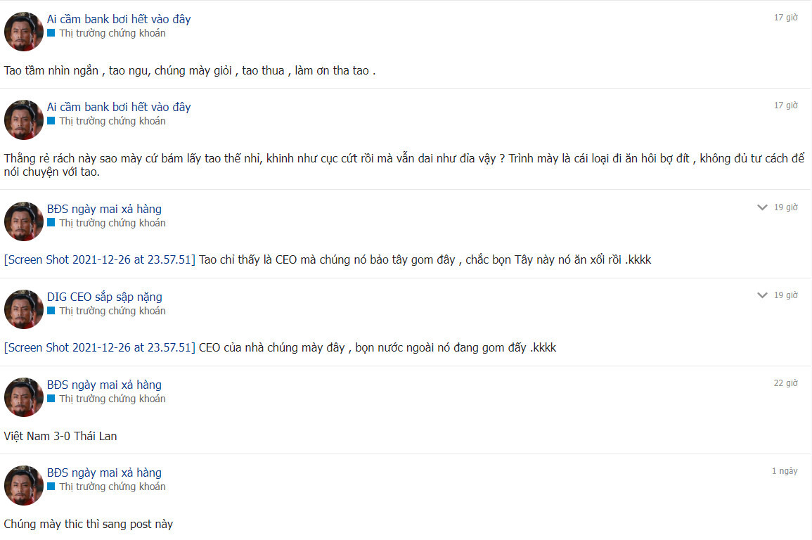 2 Con Chim Lợn này mày bán hết đi hộ tao cái, nhiều ae đang xếp hàng để được lên tàu, lũ chúng mày cứ 1 thằng đánh trống 1 thằng thổi kèn, chúng mày ko thấy mệt ah, hôm qua bảo canh xanh bán, hôm nay nó trần mày lại bảo mai bán, mày bán đi hộ tao cái cho ae khác được lên tàu, lời nguyền rủa sẽ ứng nghiệm cho 2 thằng “Trongnhan” và “TongGiang” chúng mày đi ra đường là bị xe cán chết, lời nguyền sắp ứng nghiệm rồi… Tao còn nguyền cho đến khi nào khóa mõm chúng mày lại cho ứng nghiệm để mày được đi gặp Diêm Vương…