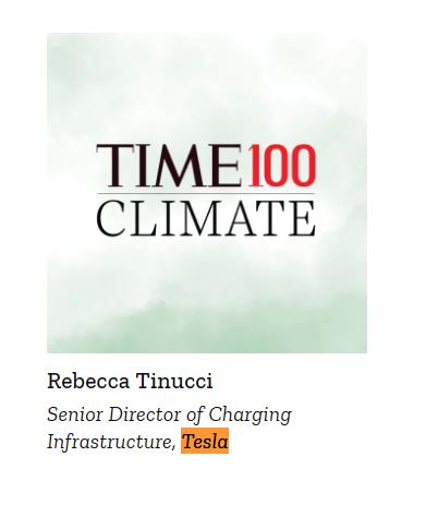 Thay vào đó, tạp chí Mỹ vinh danh bà Rebecca Tinucci - giám đốc cấp cao phụ trách mảng cơ sở hạ tầng sạc của Tesla. Ngay cả với nhiều người thường xuyên theo dõi thông tin về Tesla, đây không phải là một cái tên quen thuộc. Thậm chí vị lãnh đạo của Tesla còn "bí ẩn" tới mức Time không/chưa thể liên hệ để có một bức ảnh của bà đi kèm danh sách Time 100.
