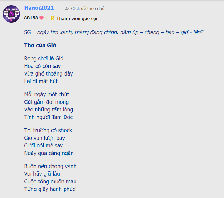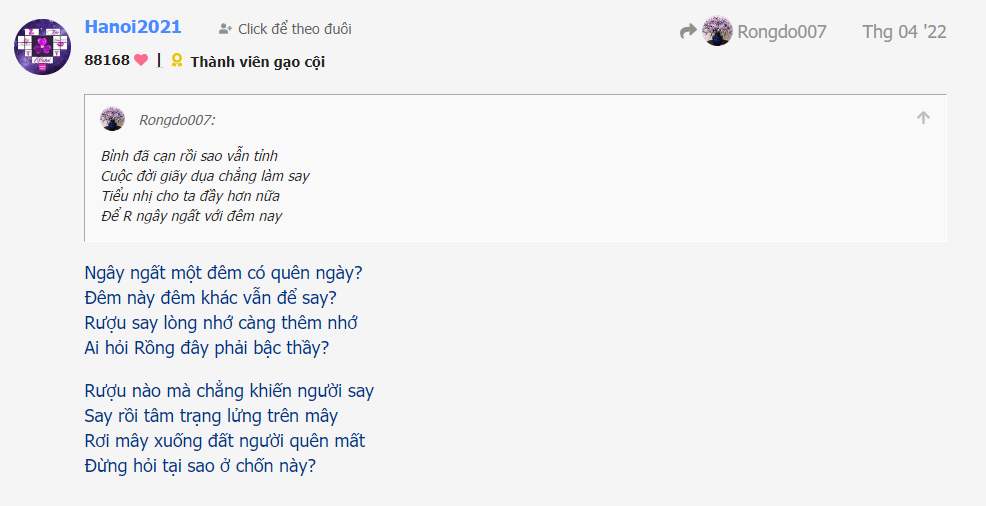 Kaka nói bà HN này phọt thơ là đúng rồi nè. Xưa cũng làm thơ hay lắm nhưng 1 lần gửi con bạn bàn bên cấp 3 đọc nó nói: mày thì làm bảo kê hợp chứ thơ mày đọc ko ngửi nổi