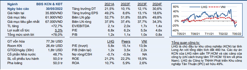 Định giá hấp dẫn đối với công ty phát triển KCN có số dư tiền dồi dào cùng một dự án có vị trí chiến lược gần TP. HCM. Ngoài diện tích đất KCN lớn đã được giải phóng mặt bằng của LHG tại KCN LH3.1 - mà chúng tôi ước tính có khoảng 45 ha đất KCN đã hoàn thành việc nộp phí thuê đất và sẵn sàng cho thuê tính đến cuối quý 1/2022 - LHG có số dư tiền mặt ròng là 960 tỷ đồng tính đến cuối quý 1/2022, tương đương khoảng 55% giá trị vốn hóa thị trường hiện tại của LHG. Chúng tôi tin rằng KCN LH3.1 sẽ đảm bảo tăng trưởng lợi nhuận của LHG trong trung hạn, trong khi kế hoạch mở rộng của dự án này (KCN LH3.2 và An Định, đang chờ Chính phủ phê duyệt đầu tư) sẽ là động lực trong dài hạn. Ngoài ra, chúng tôi tin rằng giả định vốn đầu tư tăng của chúng tôi và kế hoạch của công ty về tổng mức đầu tư của LH3.1 là thận trọng khi công ty đã giải phóng mặt bằng 91% và trả tiền thuê đất cho 83% tổng diện tích của dự án tính đến cuối năm 2021.