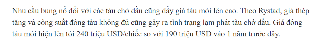 Cước chở dầu hiện tại là 64.000 USD/thùng, nhưng cước ký trước cho tháng 9 đến tháng 11 đã tăng vọt lên 105.250 USD/thùng