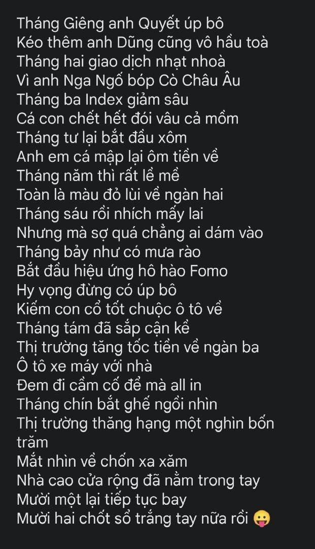 Và điều quan trọng khiến em đổi nghề là do em gặp 1 cú sốc quá lớn anh ạ. Con Thắm bạn thân cùng đầu tư chứng khoán với em (anh cũng biết), hôm trước lên cầu Bình Lợi chơi mãi không thấy về, em đã đi tìm nhưng chỉ thấy mỗi đôi dép kỷ niệm ngày xưa. Ngày hôm qua em mới nhận được bức thư nó gửi lại cho em với nội dung : "mình đã đặt niềm tin vào chứng khoán nhưng hình như niềm tin ấy không có đáy hay đáy sau thấp hơn đáy trước. Theo mình bạn hãy bỏ nghề chứng đi thu mua ve chai và giấy vụn vì sớm muộn thị trường sẽ bán tháo đống giấy các công ty in cho các nhà đầu tư, lí do là họ đã nhập nhầm máy in cổ phiếu quá hiện đại và qui mô lớn , điều quan trọng hơn là họ đã không dự đoán đúng cung cầu” . Em buồn suốt mấy ngày anh ạ.