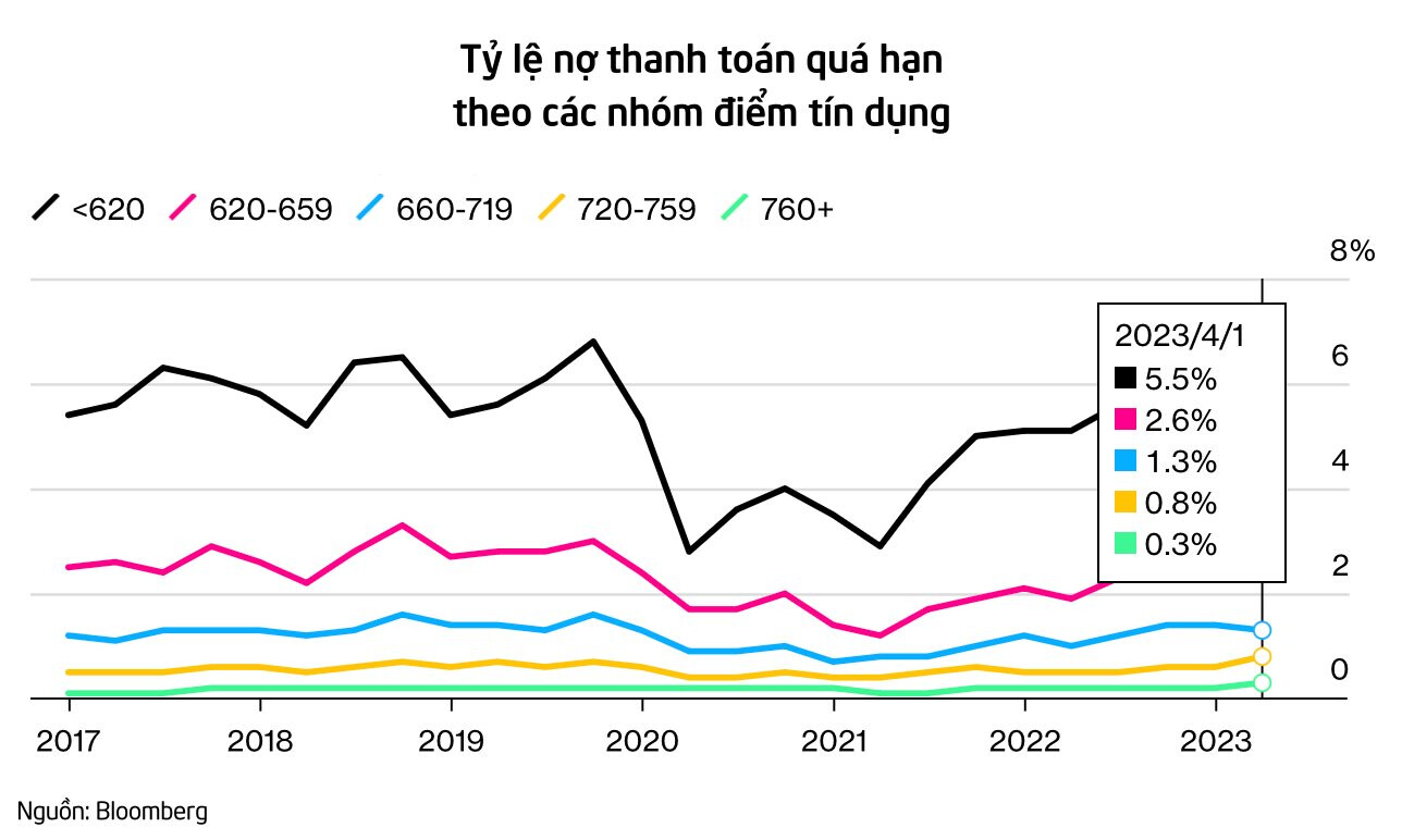 Nghiên cứu từ Fed New York cho thấy, các khoản nợ tiêu dùng quá hạn đối với thẻ tín dụng hay vay mua ô tô đang gia tăng, sau khi giảm xuống mức “bất thường” vào năm 2020 và 2021. Khi đó, người tiêu dùng được hưởng lợi từ các chương trình hoãn thanh toán nợ và hỗ trợ liên bang.
