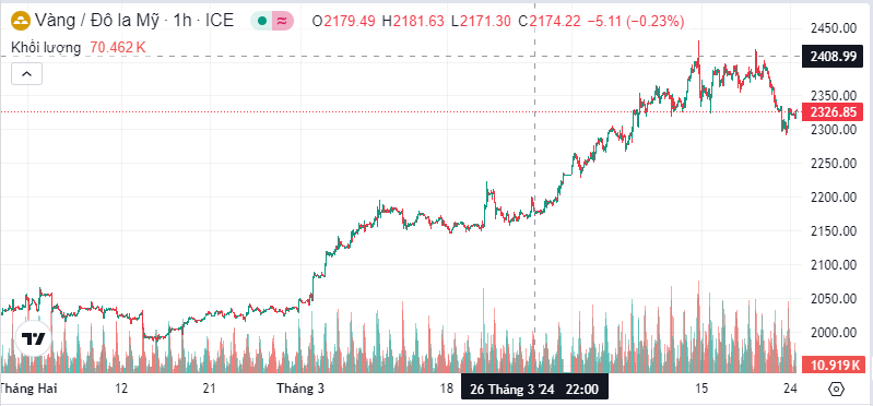 Giá vàng đã ổn định trở lại sau khi giảm mạnh 60 USD/ounce, có lúc chạm mức 2.304 USD/ounce. Với đợt giảm giá vàng lần này, theo phân tích kỹ thuật, mới chỉ là một đợt điều chỉnh sau khi vàng đã tăng khoảng 22% trong 2 tháng qua. Đợt điều chỉnh này nằm trong một xu hướng đi lên dài hạn của vàng.