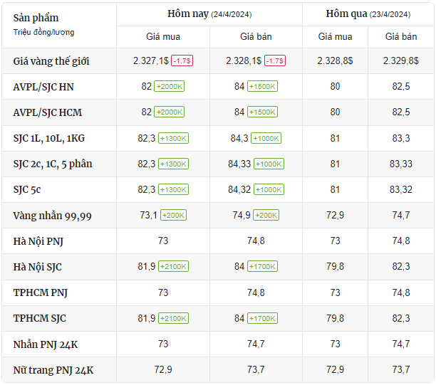 | Giá vàng được cập nhật lúc 11h15 ngày 24/4 |