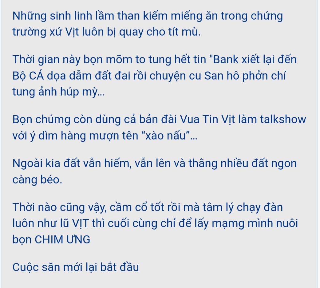 Nhưng chúng nó cứ nắn dòng tiền tầm bậy thì nát hết, tiền không vào BDS - trên sàn BDS không dẫn sóng thì đi viện hết.