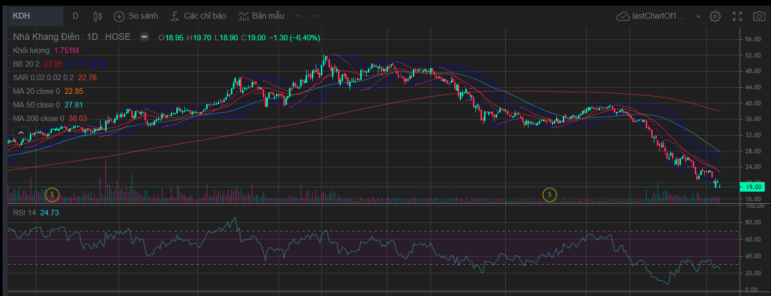 Cổ phiếu KDH đang được giao dịch tại vùng giá 19,000 đ/cp giảm mạnh so với mức gia 50,00 d/cp vào đầu năm 2022.