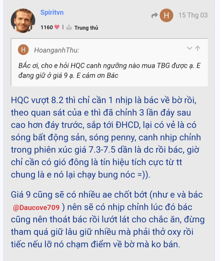 Như e đã vài tháng hầu như ko mua bán gì từ đợt sụp tháng 1, chỉ ôm cây đợi thỏ, bỏ qua sóng dầu khí và phân bón vì ko phù hợp tiêu chí bản thân, ko kiếm dc như nhiều ae nhưng thấy thoải mái, mãi cũng có vẻ tới lượt, hy vọng kiếm dc chút tiền uống bia.