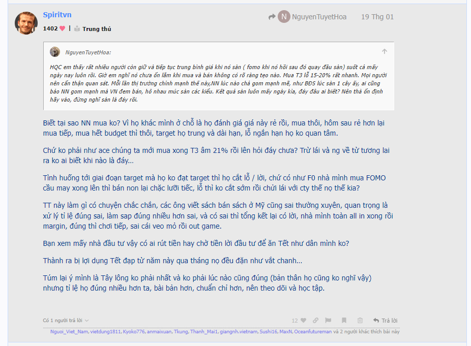 Ko phải post lại để chứng minh mình đúng, mà là để các bác thấy được là NN, tổ chức người ta mua là tầm nhìn nhiều tháng, định giá, target, chiến lược khác. Nhưng cần hiểu là NN, tổ chức người ta dù có lúc đúng lúc sai thì cơ bản mức giá mà họ mua vào là họ có cơ sở định giá, nó sẽ tương đối hợp lí để nhìn theo.