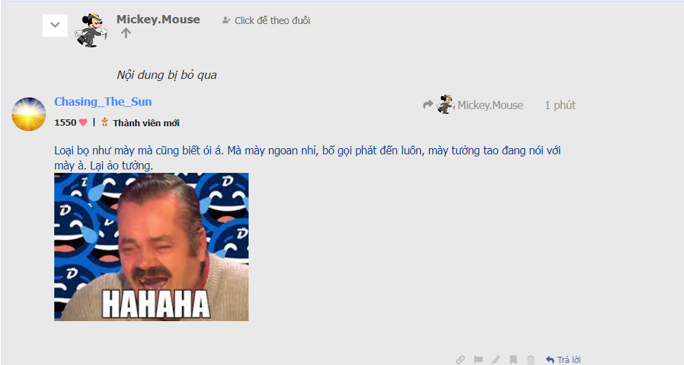 Loại bọ như mày mà cũng biết ói á. Mà mày ngoan nhỉ, bố gọi phát đến luôn, mày tưởng tao đang nói với mày à. Lại ảo tưởng.