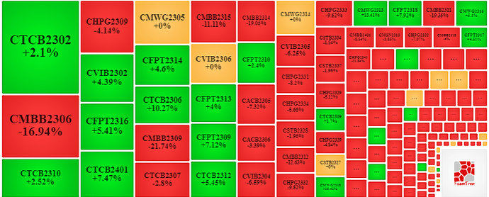 Trong phiên giao dịch ngày 23/04/2024, bên bán quay lại áp đảo hoàn toàn thị trường khiến phần lớn các mã chứng quyền giảm mạnh. Cụ thể, các mã chứng quyền lớn trong nhóm giảm giá là CMBB2306 , CHPG2309 , CTCB2307 và CACB2305 .