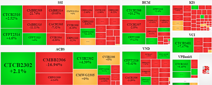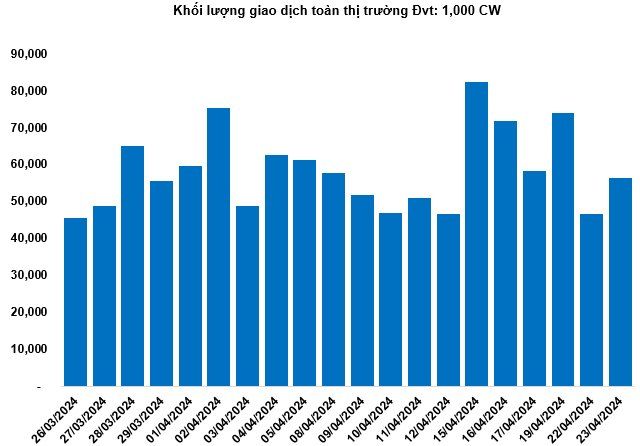 Khối lượng giao dịch toàn thị trường trong phiên 23/04 đạt 56.34 triệu CW, tăng 21.06%; giá trị giao dịch đạt 38.13 tỷ đồng, tăng 57.02% so với phiên 22/04. Trong đó, CSTB2322 là mã dẫn đầu thị trường về khối lượng với 4.18 triệu CW; CFPT2316 dẫn đầu về giá trị giao dịch với 3.29 tỷ đồng.