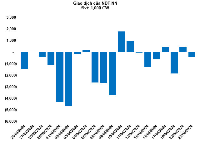 Khối ngoại quay lại bán ròng trong phiên 23/04 với tổng mức bán ròng đạt 447,100 CW. Trong đó, CSTB2332 và CSTB2330 là hai mã bị bán ròng nhiều nhất.