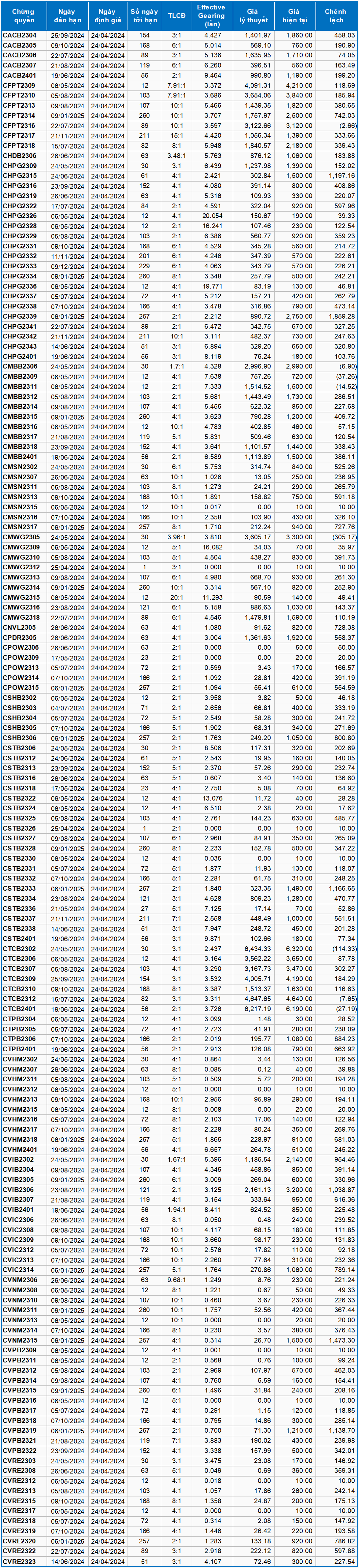 Dựa trên phương pháp định giá phù hợp với thời điểm khởi đầu là ngày 24/04/2024, mức giá hợp lý của các chứng quyền đang được giao dịch trên thị trường được thể hiện như sau: