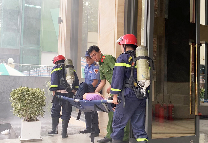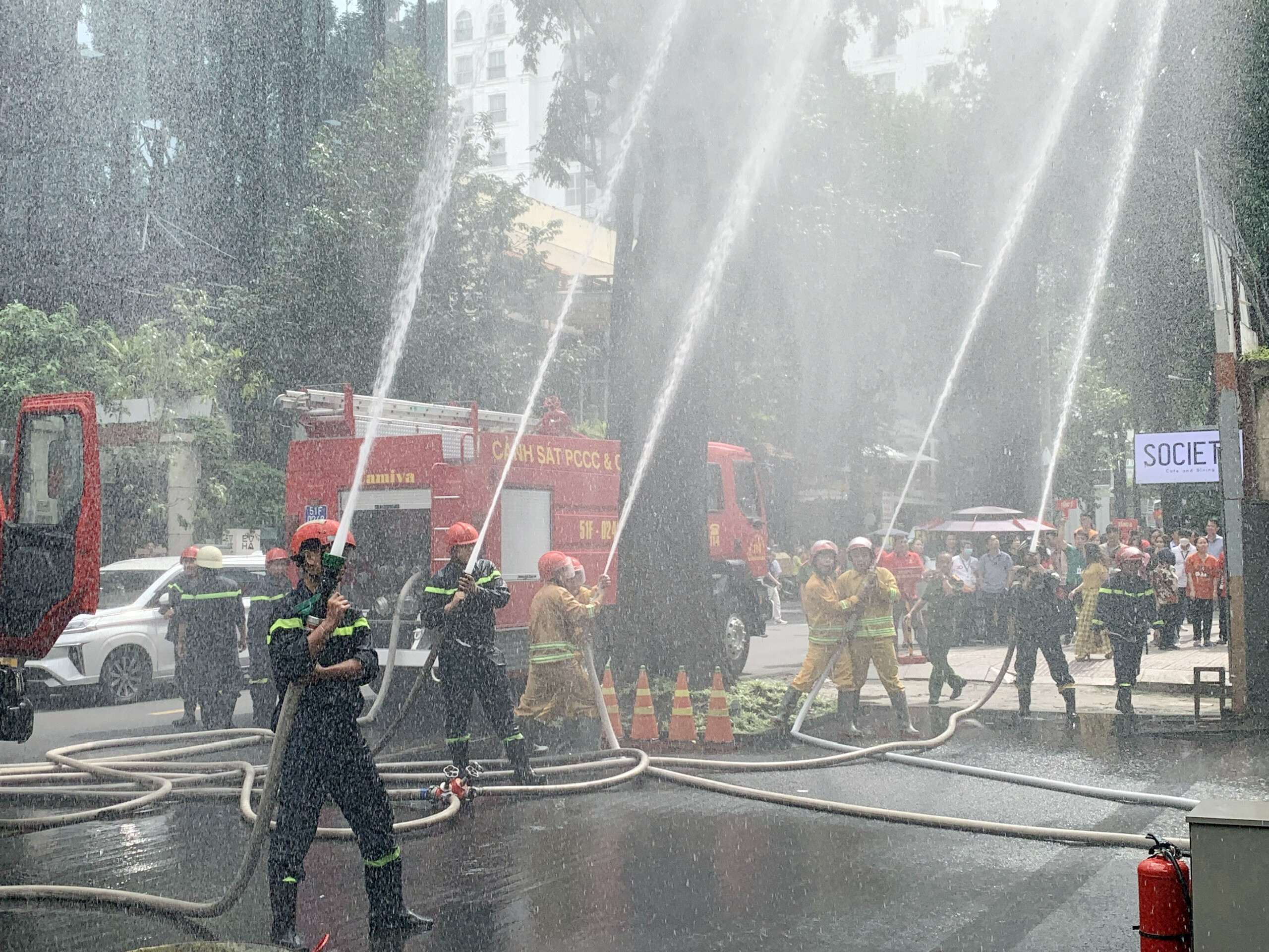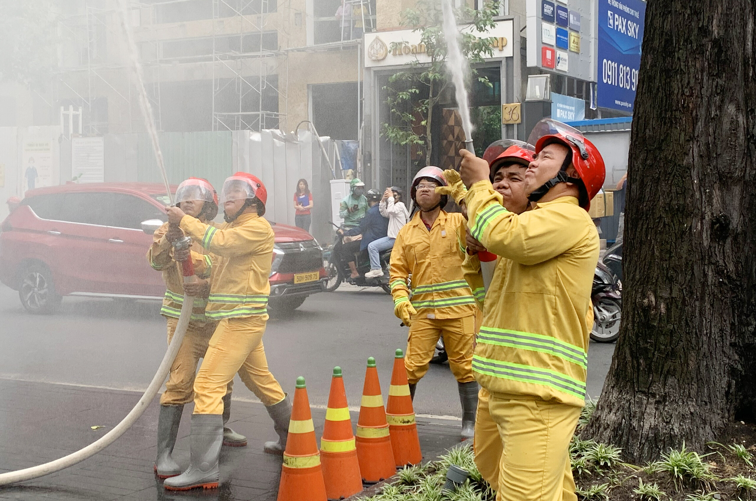 Tình huống giả định cháy xảy ra, đội PCCC cơ sở của tòa nhà đã cùng với đội PCCC chuyên nghiệp thực hiện di tản các nhân sự làm việc tại Tòa nhà đến nơi an toàn bằng thang cứu hộ và đồng thời triển khai dập tắt lửa trên cao bằng vòi rồng cứu hỏa.