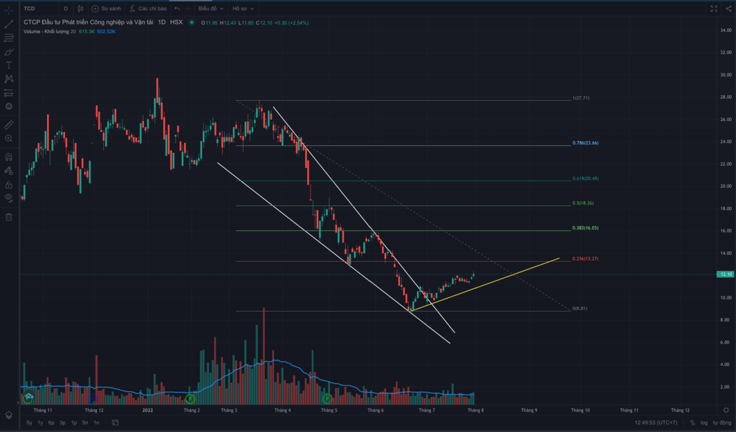 TCD đã thoát khỏi downtrend rồi, đang sideway up khá đẹp (vẫn giữ vùng trend tăng từ đáy), tạo nền hấp thụ lực cung vùng cao hơn, như sếp đã nhận định và mình vẽ chart thì cũng tương đồng là tới vùng này hoặc mạnh hơn tý là 13.x sẽ điều chỉnh.