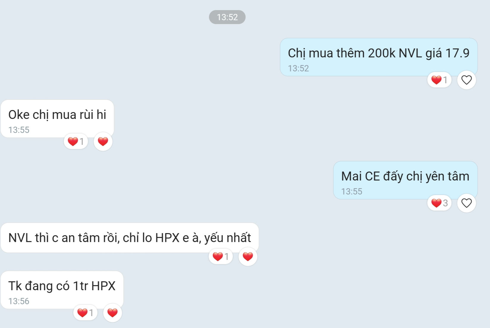 Cậu phải hiểu rằng những người tài khoản trăm tỷ ko đi hỏi đám vô danh tư vấn. Bà chị này vừa vào 1 triệu NVL và 1 triệu HPX hôm qua và hôm nay, chưa bao gồm đang giữ hơn 40 tỷ vào DIG, CEO, L14…tài khoản của họ rất lớn nhưng họ cầu thị và học hỏi ko giống đám trẻ ngông cuồng như cậu !