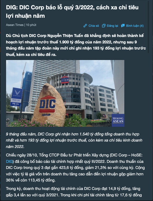 Dù Chủ tịch DIC Corp Nguyễn Thiện Tuấn đã khẳng định sẽ hoàn thành kế hoạch lợi nhuận trước thuế 1.900 tỷ đồng của năm 2022, nhưng sau 9 tháng đầu năm tập đoàn này mới chỉ ghi nhận 193 tỷ đồng lợi nhuận trước thuế, kém xa chỉ tiêu đề ra.