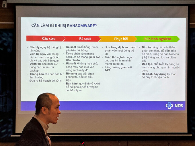 Theo ông Sơn, quy trình xử lý khi bị ransomware diễn ra trong bốn giai đoạn, gồm: cấp cứu, rà soát, phục hồi và rút kinh nghiệm. Để đưa một hệ thống trở lại hoạt động, tức giai đoạn phục hồi, bước rà soát là giai đoạn quan trọng để đảm bảo tạo ra một môi trường mạng sạch. Các đơn vị sẽ phải tìm và vá lỗ hổng trên hệ thống, rà kỹ từng máy chủ và đưa từng thành phần hoạt động trở lại, sau khi đã bổ sung các phương án phòng thủ cần thiết.