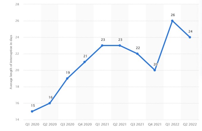 Thời gian gián đoạn trung bình của một công ty sau khi bị ransomware. Ảnh: Statista