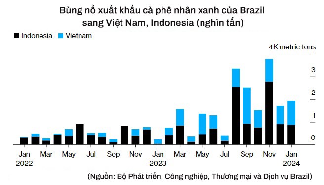 Trong khi đó, các lô hàng cà phê từ Brazil đến Việt Nam cũng đang tăng mạnh, tăng hơn 6 lần từ tháng 1/2023-1/2024, theo báo cáo của Cecafé.