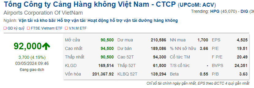 Tính tới lúc 9h20 ngày 03/05, cổ phiếu ACV vọt hơn 4% lên 92,000 đồng/cp, là mức cao nhất trong hơn 2 năm qua. Đáng chú ý, vốn hóa thị trường đã vượt mốc 200,000 tỷ đồng, lọt top 4 công ty có vốn hóa lớn nhất sàn chứng, chỉ kém VCB, BID và VGI.